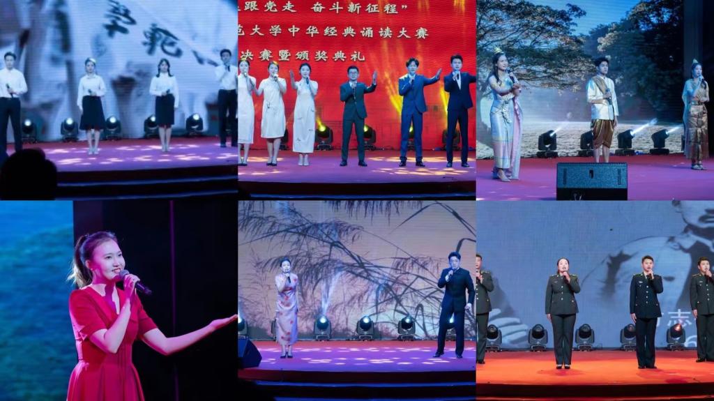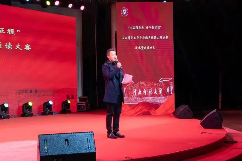 为贯彻落实党的二十大精神,深入开展社会主义核心价值观宣传教育,全面落实教育部《关于切实加强新时代高等学校美育工作的意见》,11月17日晚,由党委宣传部、教务处、公共艺术教育中心、校团委等部门主办,传媒学院、音乐舞蹈学院等承办的“永远跟党走 奋斗新征程”中华经典诵读大赛在我校呈贡校区东区贝壳广场举行。校党委副书记李宏、副校长武友德、党委宣传部部长余冰释、教务处处长陈新、学生处处长张国华、研究生处处长黄海涛、公共艺术教育中心副主任何纾、校团委副书记赵彪、音舞学院书记和红军、副书记杨劲勐、传媒学院副院长肖青莅临比赛现场观赛和指导。本次决赛暨颁奖典礼由传媒学院谭辉老师担任总导演,由云南广播电视台主持人王益洲、李丹、樊亦涵、刘永京和马莎担任评委。