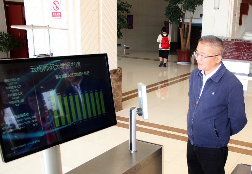 在自习区域,张祖武与学生亲切交流,了解他们的学习情况,并通过门禁大数据显示屏了解各学院入馆读者的数据。