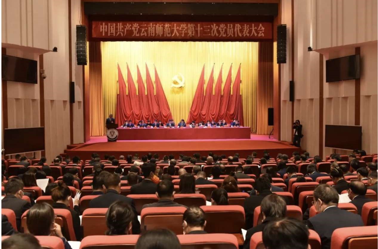 会场内,203位党员代表出席,主席台后幕正中的党徽与两侧的红旗交相辉映,主席台上方“中国共产党云南师范大学第十三次党员代表大会”的会标庄严沉稳,映照出力量和责任。