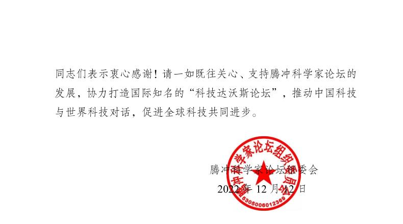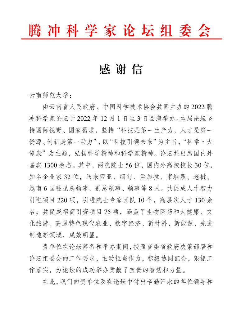 近日,学校收到腾冲科学家论坛组委会发来的感谢信。信中指出,在论坛筹备和举办期间,云南师范大学按照省委省政府决策部署和论坛组委会的工作要求,主动担当作为,狠抓工作落实,为大会的成功举办贡献了宝贵的智慧和力量。