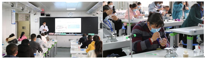 按照项目要求,我校继续教育学院在省教育厅教学仪器装备中心的指导下精心设置了培训课程。围绕组织开展好2023年云南省化学、物理实验中考的标准、考试方案、考试组织、实验教学改革评价等方面,两个学科分别邀请了教育部基础教育化学教学指导专委会夏建华副主任、省教育厅教学仪器装备中心主任杨志军研究员、教育部基础教育教学指导专业委员会考试命题专委会委员李碧松、云南师范大学彭朝阳教授、孙晓春副教授、云南大学附属中学西林分校副校长洪涛老师、昆明理工大学附属中学校长助理董振邦老师等开展了专题讲座。在实践操作环节,学员们按照实验操作培训要求,参照实验操作规范,在实验教师的指导下,认真练习实验操作,将8个化学、20个物理必做实验操作熟记于心。在实验操作考核过程中,学员们能规范、娴熟地进行实验操作,最终所有学员均通过了实验考核。