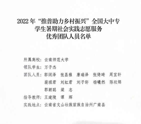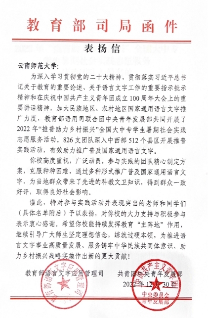 近日,教育部语言文字应用管理司、共青团中央青年发展部联合向我校发来表扬信,肯定并赞扬了学校在2022年“推普助力乡村振兴”全国大学生社会实践志愿服务活动中的突出表现和取得的良好社会影响。这是云南师范大学继2021年后第二次受到上述两部门的联合表扬。