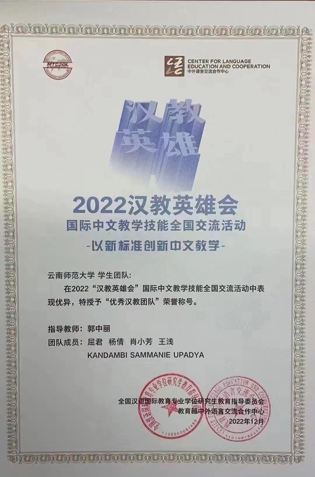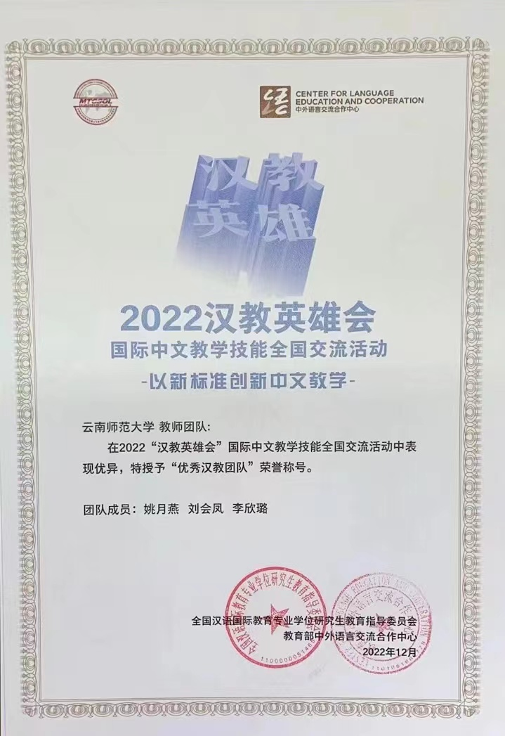 近日,从全国汉语国际教育专业学位研究生教育指导委员会、中外语言交流合作中心获悉:云南师范大学国际汉语教育学院荣获2022“汉教英雄会”国际中文教学技能全国交流活动教师组及学生组“优秀汉教团队”荣誉称号。