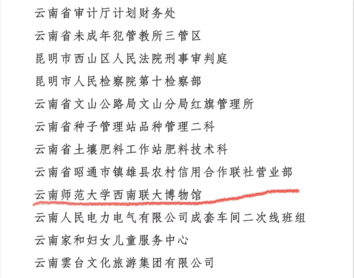 为表彰先进、树立榜样,进一步激励广大妇女坚定不移听党话、跟党奋进新征程,在“三八”国际劳动妇女节到来之际,全国妇联公布了《关于表彰全国三八红旗手标兵、全国三八红旗手、全国三八红旗集体和全国巾帼建功标兵、全国巾帼文明岗、全国巾帼建功先进集体的决定》,云南师范大学西南联大博物馆获评全国巾帼文明岗荣誉称号。