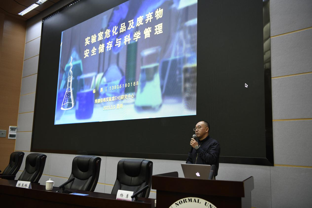 随后,南京农业大学兼职教授、埃德伯格实验室EHS研究中心主任杨勇做了“高校实验室危化品及废弃物安全储存与科学管理”的实验室安全培训。杨勇从实验室安全典型事故案例分析、常见实验室安全隐患展示到国家生产安全标准法规的解读等方面进行了讲授,并结合了我校实验室安全检查存在的问题,对我校的实验室安全改进工作提出了具体可行的指导。