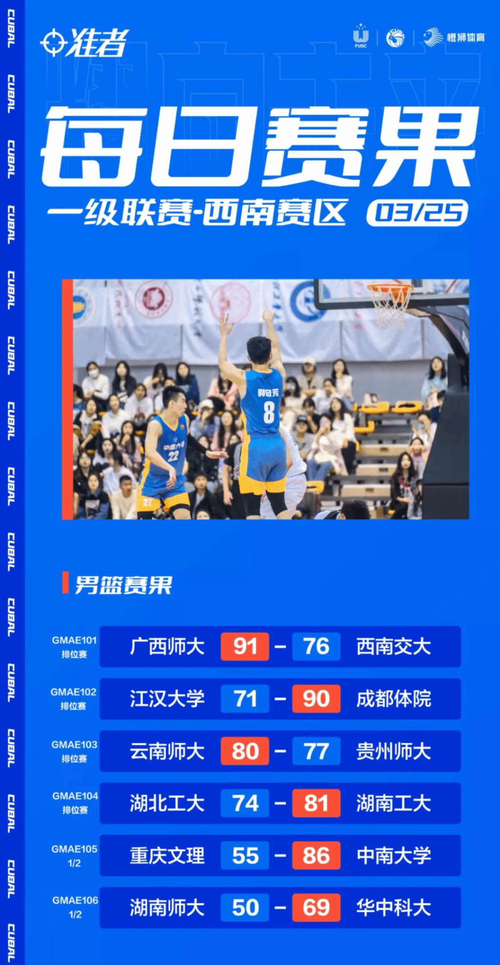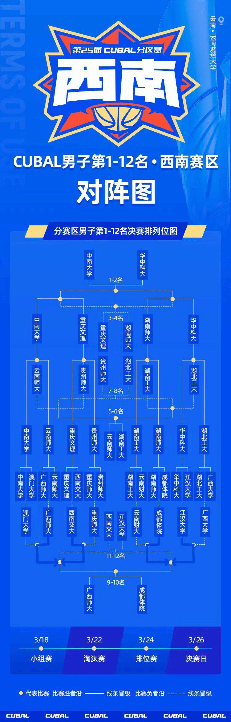 中国大学生篮球联赛CUBAL一级联赛西南赛区的比赛于3月16日至26日在云南财经大学举行。我校男子篮球队同上届分区赛第三名湖南师范大学、第五名华中科技大学以及西南交通大学、西藏民族大学分在C组。