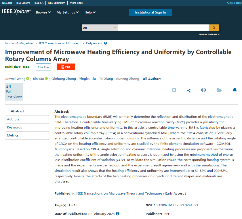 近日,我校物电学院光学工程博士研究生在国际微波领域顶级期刊IEEE Transactions on Microwave Theory and Techniques(中科院SCI一区Top期刊)发表研究论文“Improvement of Microwave Heating Efficiency and Uniformity by Controllable Rotary Columns Array”,博士研究生王均委为第一作者,文章通讯作者为物电学院姚斌副教授、郑勤红教授,云南师范大学为第一完成单位。