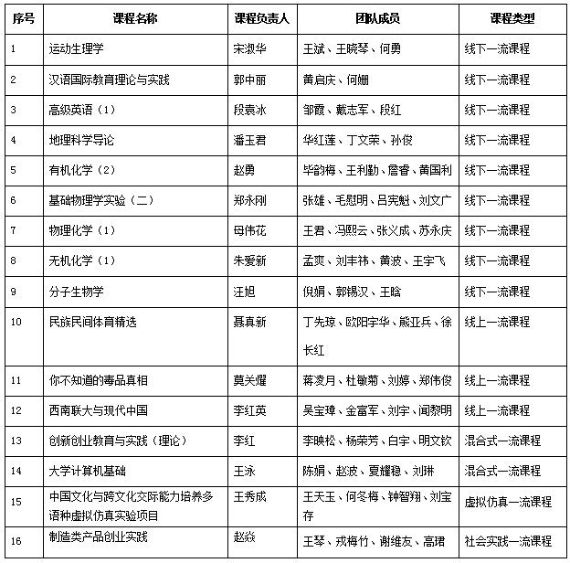 4月11日,教育部高等教育司发布了《关于第二批国家级一流本科课程认定结果的公示》,我校共有16门课程入选国家级一流本科课程认定结果公示名单,其中线下一流课程9门,线上一流课程3门,混合式一流课程2门,虚拟仿真一流课程1门,社会实践一流课程1门,实现了国家级各类一流课程全覆盖,总体数量居云南省高校第二,与第一批相比取得了重大突破。