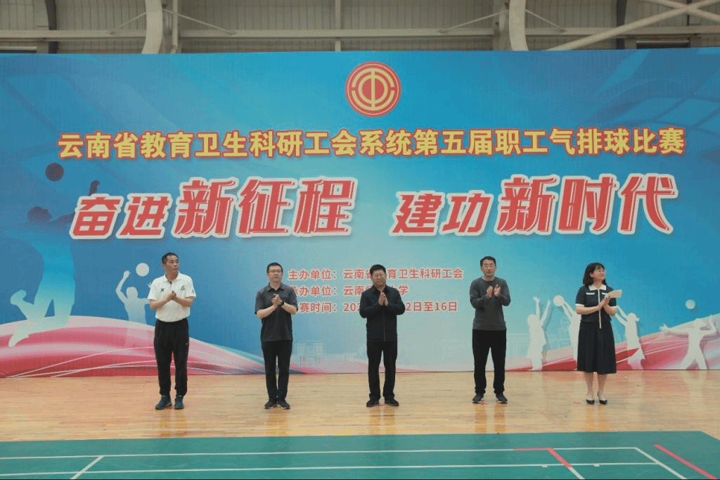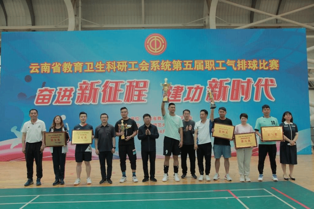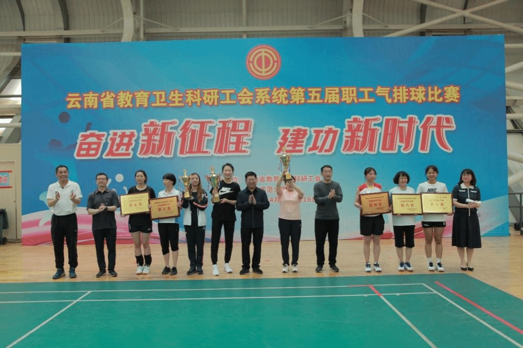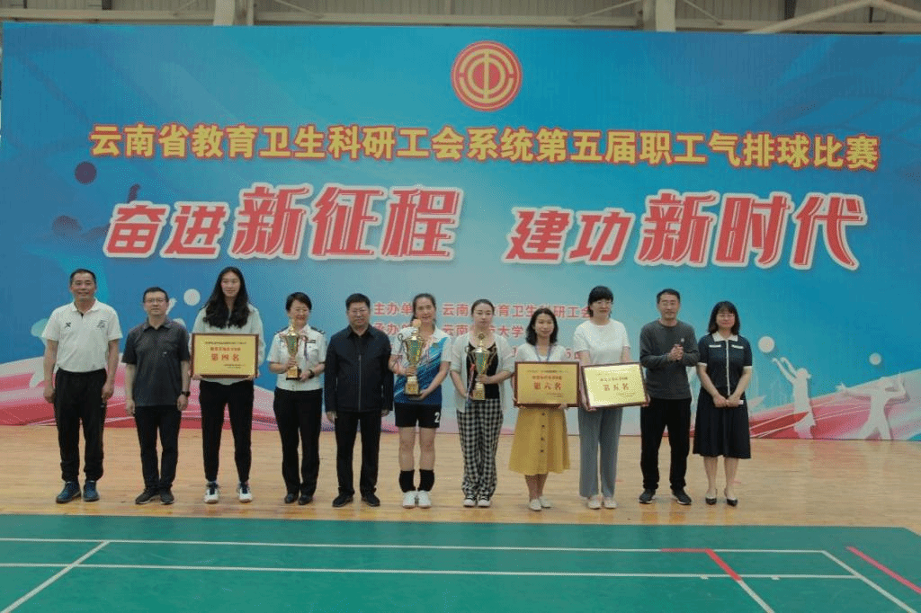 奋进新征程,建功新时代。经过5天的精彩比拼和激烈角逐,4月16日下午,云南省教育卫生科研工会系统第五届职工气排球比赛圆满落下帷幕,闭幕式在我校呈贡校区东区体育馆举行。云南省教育卫生科研工会主席李志恩,副主席、女工委主任张晓露,校党委副书记、工会主席张玮,副校长牛治亮,工会常务副主席金黄斌以及各参赛队伍参加了闭幕式。闭幕式由省教卫科工会二级调研员、经审委主任普春昆主持。