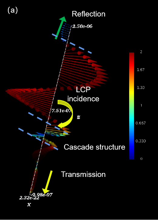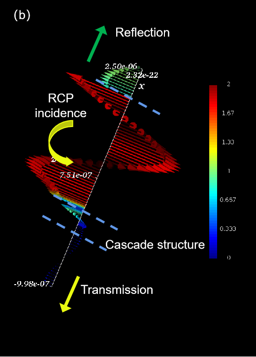 图2 设计的用于探测左旋圆偏振光(a)和右旋圆偏振光(b)的光学超表面结构的透射和反射光谱的偏振态