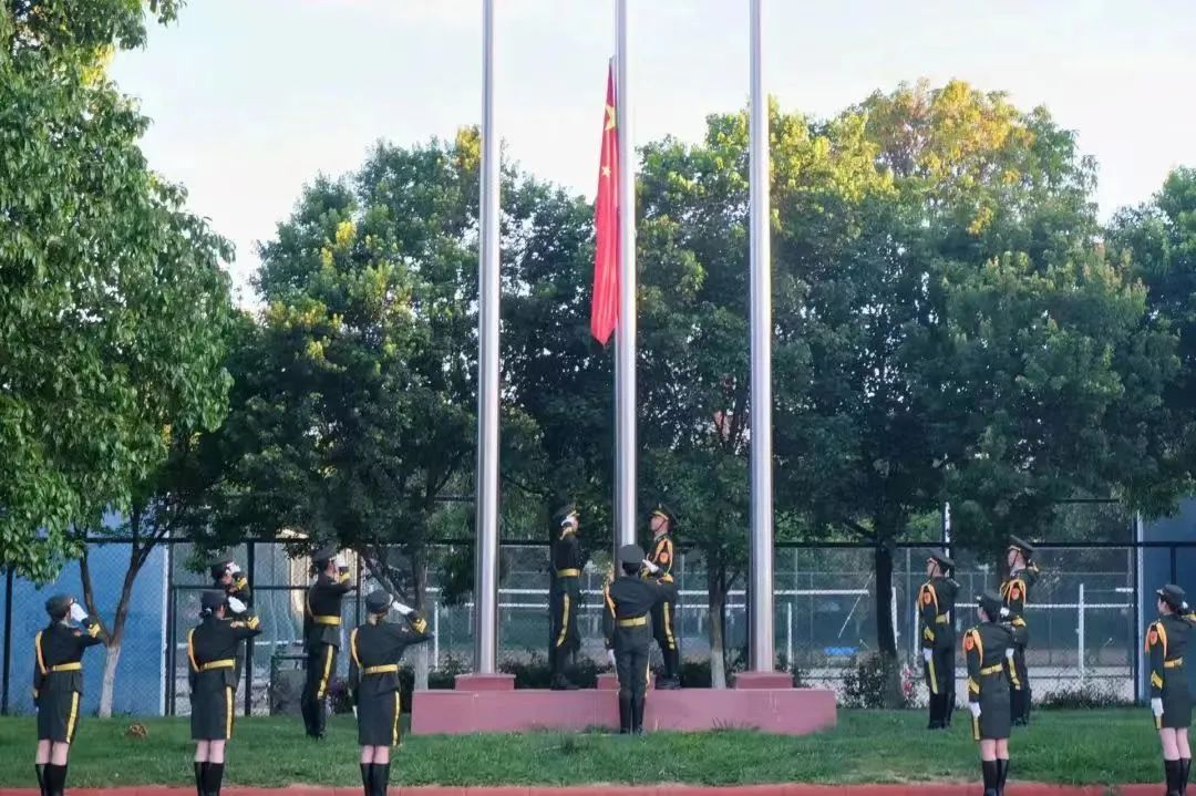 早上7点升旗仪式正式开始。在参会师生的注目礼下,英姿飒爽的国旗护卫队队员护送鲜艳的五星红旗进场。伴随着庄严的中华人民共和国国歌,五星红旗冉冉升起,迎风飘扬。