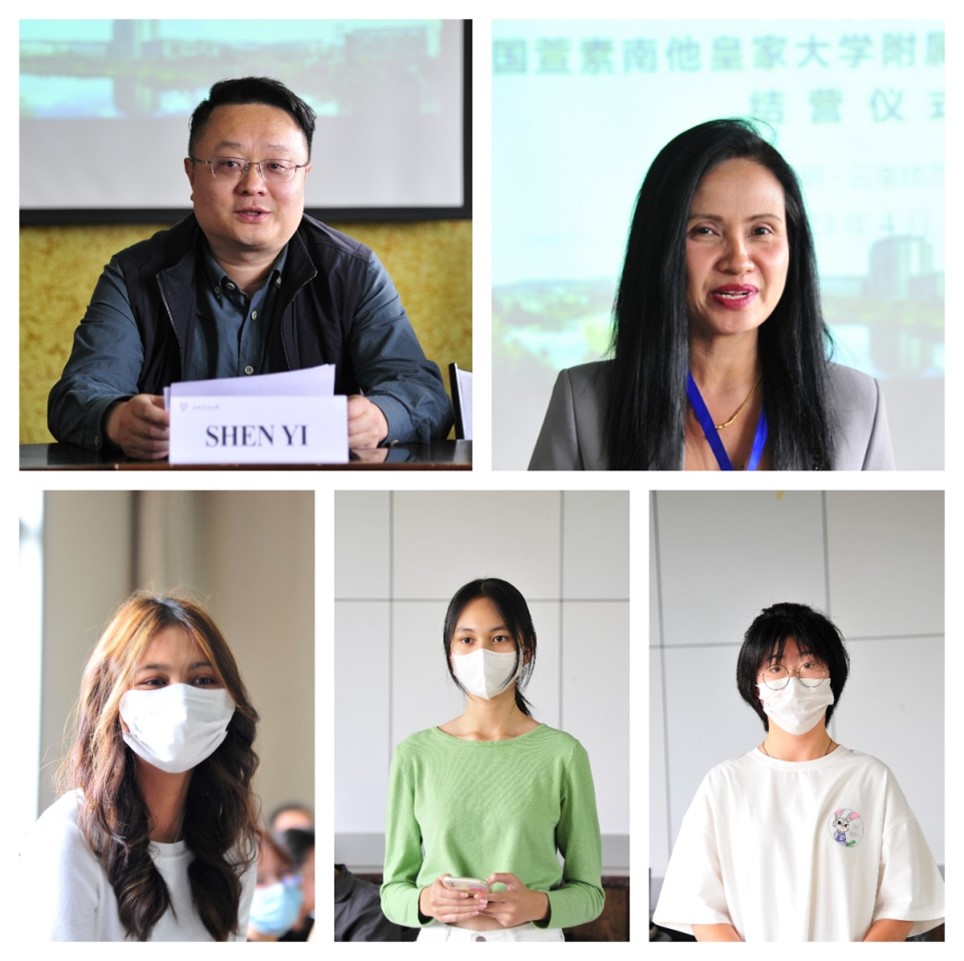 汉语国际推广师资培训基地(昆明)常务副主任沈毅,泰国萱素南他皇家大学附属中学副校长布拉克·派池娜,泰方领队教师张宏宾、廖佳佳、纳塔瓦特·吉诺瓦特,31名泰国高中学生参加了结营仪式。