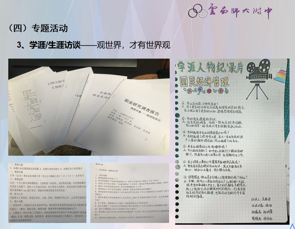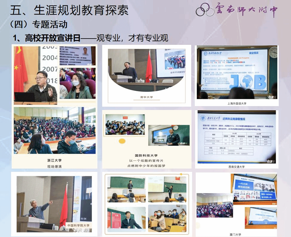 云南师大附中高中生涯规划教育秉承全员参与、团队实施、家校协作的理念,尊重学生个体及社会发展的实际,以学生为主体,聚焦在“引导生涯探索、助力选科升学、解决现实困境、支持终身发展”几大方面,通过全员育人、活动育人、环境育人、学科融合,发掘学生资源和潜能,注重“积极品质”“社会适应”“自主发展”能力的培养。