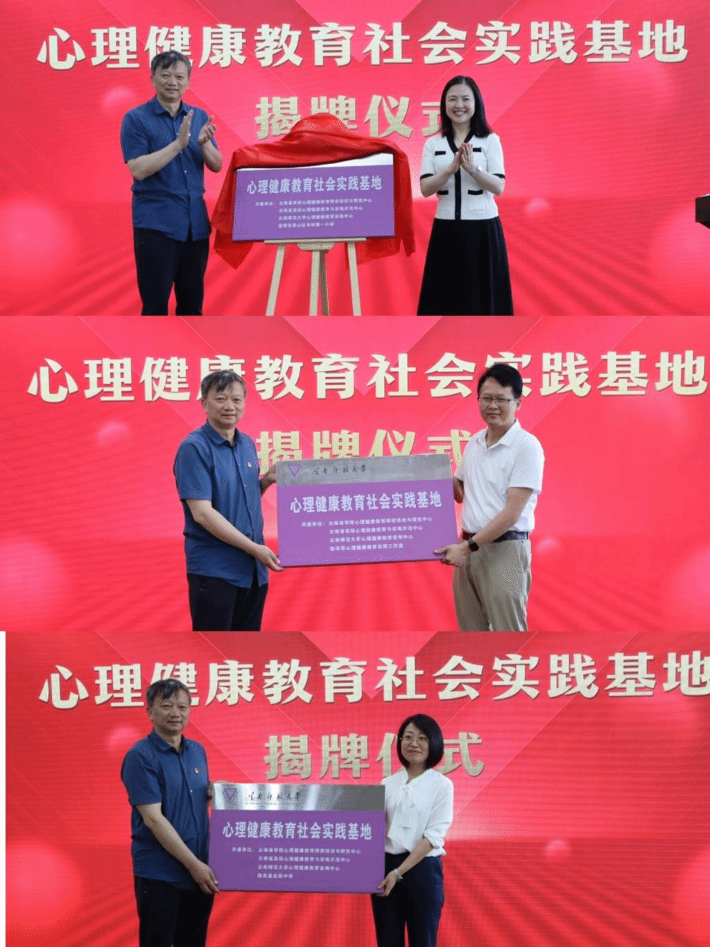 云南师范大学心理健康教育咨询中心与昆明市西山区书林第一小学、彭华军心理健康教育名师工作室、陆良县北辰中学进行了共建心理健康教育社会实践基地的挂牌,共同开拓心理健康教育新局面,携手共建咨询服务“试验田”。