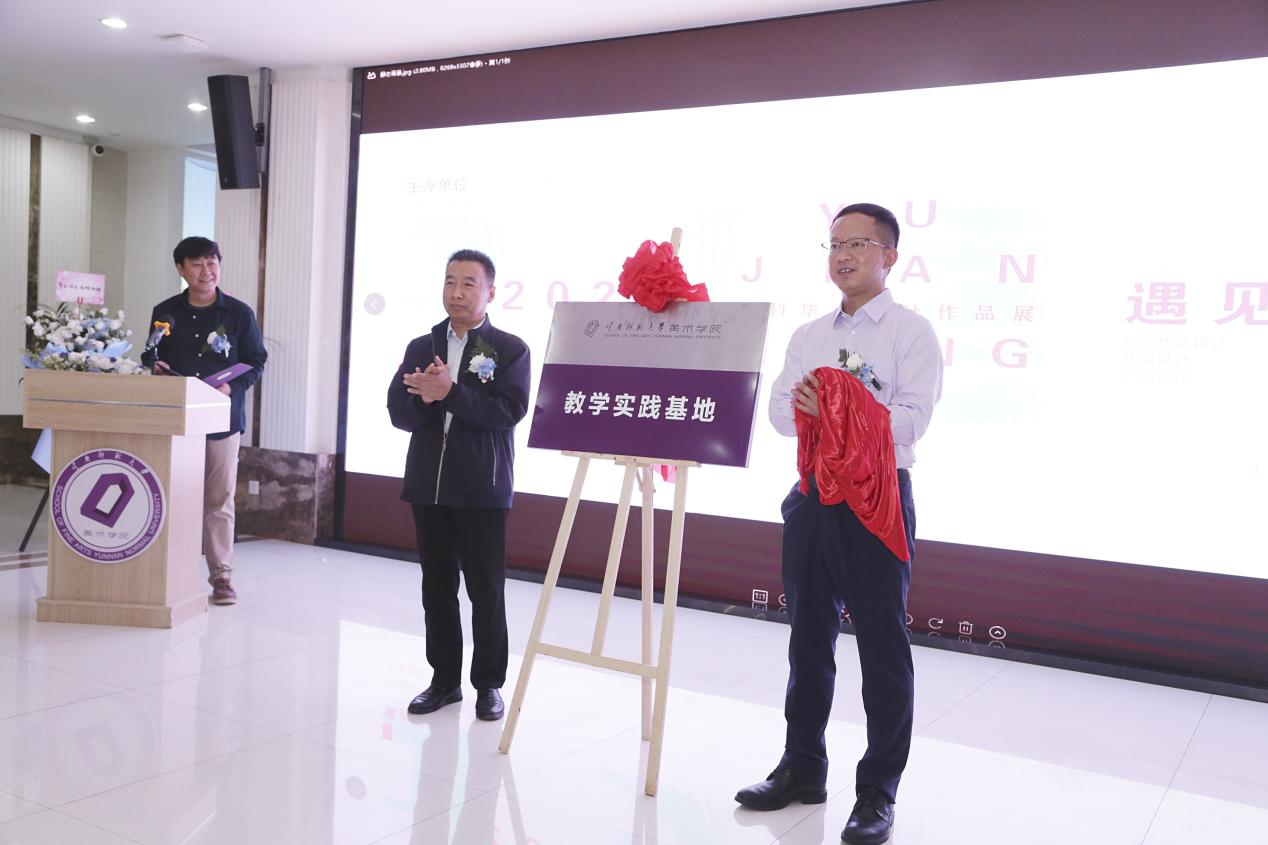 梁河县副县长韩晓光、美术学院党委书记包绍红共同为“云南师范大学美术学院实践教学基地”揭牌。戴杰表示,实践教学基地的建立将产出更多的设计项目和成果,期待这些成果能更好地助力梁河发展。