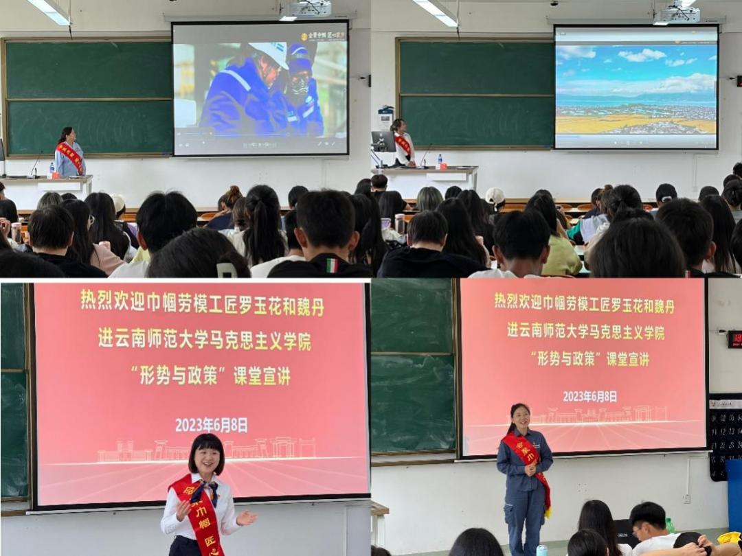 6月8日,中国移动通信集团云南有限公司市场经营部张滔、云南建投机械制造安装工程有限公司女焊工队长孙梅、云南电网有限责任公司德宏供电局500kV德宏变电站站长罗玉花、云南航空产业投资集团昆明机场运行指挥中心班组长魏丹4位巾帼劳动模范工匠走进我校呈贡校区,向广大师生讲述她们立足本职、忘我劳动、乐观进取、争创一流的态度和精神。