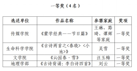 展演精彩纷呈。传媒学院王琳等家庭的《蒙学经典——节日篇》、地理学部刘云家庭的《古诗背诵:李白诗四首》、生命科学学院吴雪家庭的《古诗两首之<春晓><小池>》、文学院汪玉梅家庭的《沁园春·雪》,爸爸妈妈同孩子或是娓娓道来,或是声情并茂,或是抑扬顿挫,或是铿锵有力,展示出中华经典诗词的雅致韵味和深远意境。教育学部禹紫灵家庭的《一搜巨轮的故事》、图书馆王斌家庭的《雷锋叔叔,你在哪里》、基教集团张语珂家庭的《中华颂》,则在饱含深情的诵读中,倾诉着对五千年历史的回望、对革命先烈的缅怀、对伟大祖国的热爱、对中华民族的赞歌。