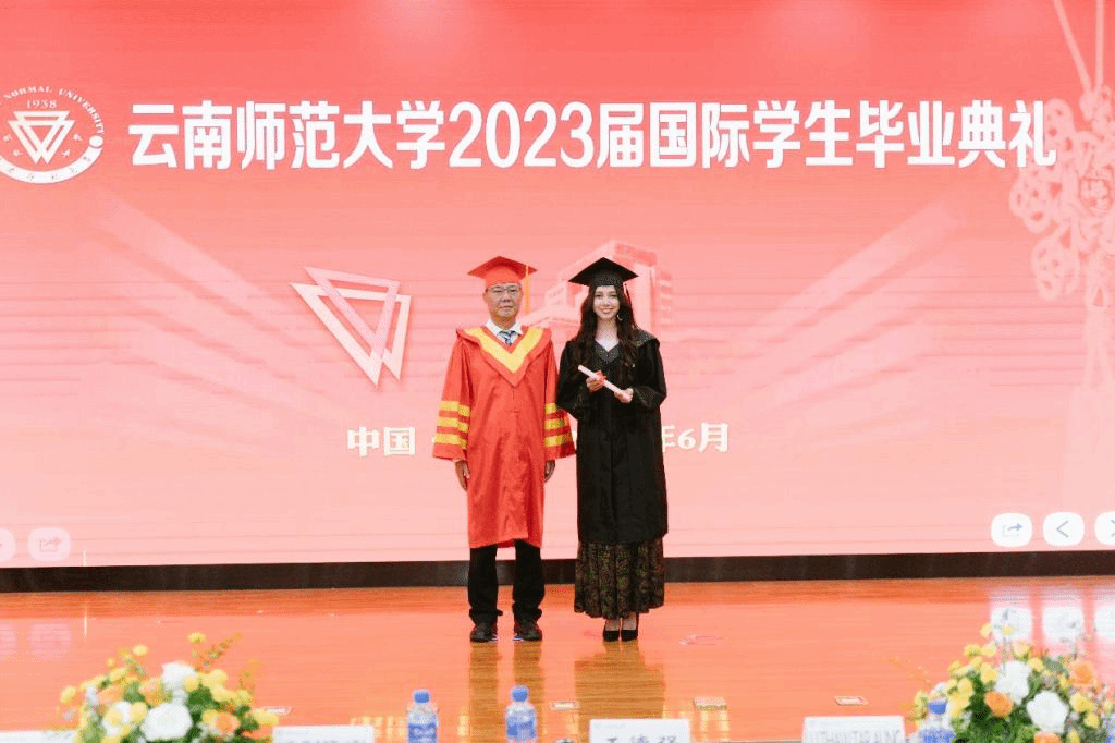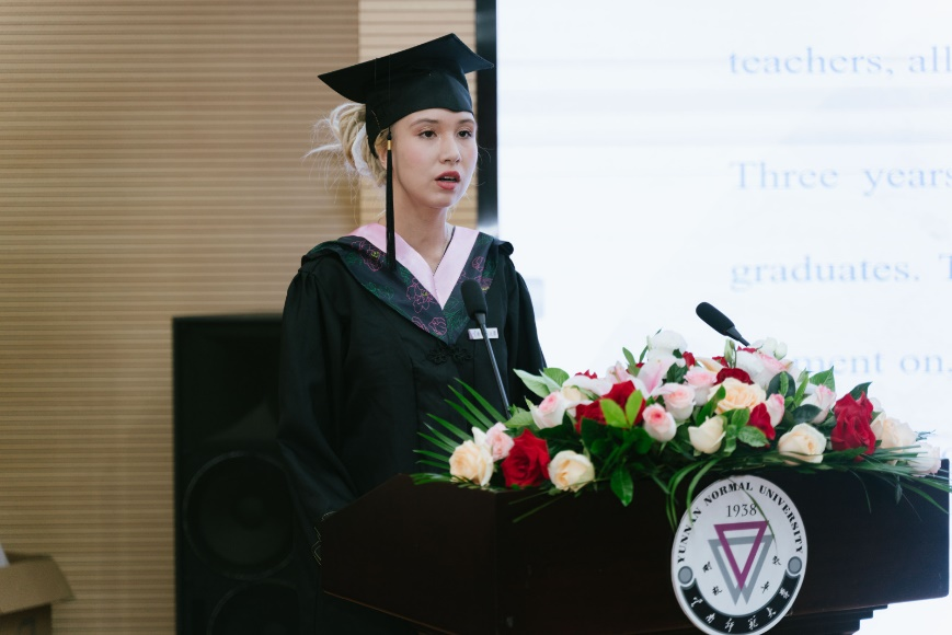 来自俄罗斯的丽塔同学作为国际生本科毕业生代表发言,她感恩在学校度过的青葱岁月,从此刻开始,她将带着云南师范大学的印记,走到世界各地,把这些年里的所有努力化成通往未来的阶梯。