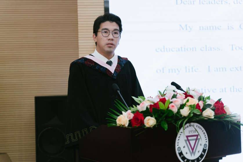 来自泰国的陈兴福同学作为国际生往届毕业生代表发言,他认为在云南师范大学学习的四年时光是他人生中最美好的回忆。在师大他不仅学到了知识,还开阔了视野,今后会将所学应用到实践中,并向更多的人传播中国文化。