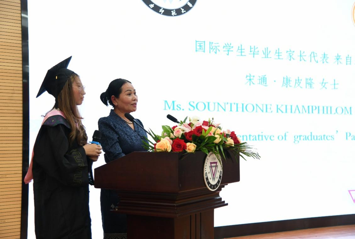 老挝的龙玲同学家长宋通·康皮隆女士作为毕业学生家长代表向全体毕业的学子送上了真挚的祝福,对学校的领导、老师的培养关怀表示由衷的感谢。