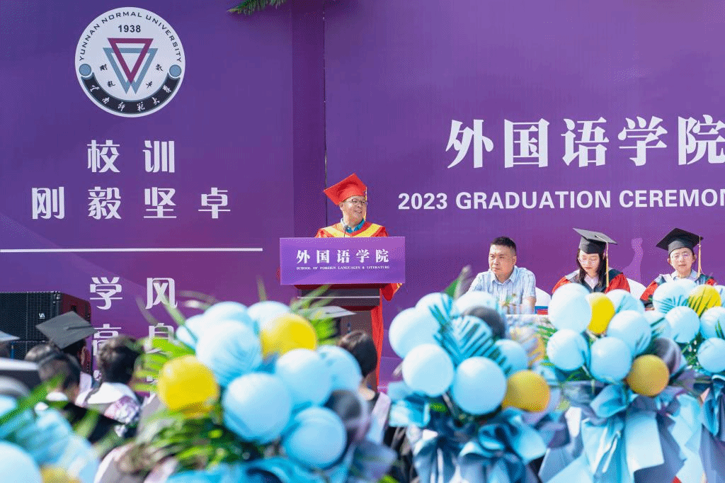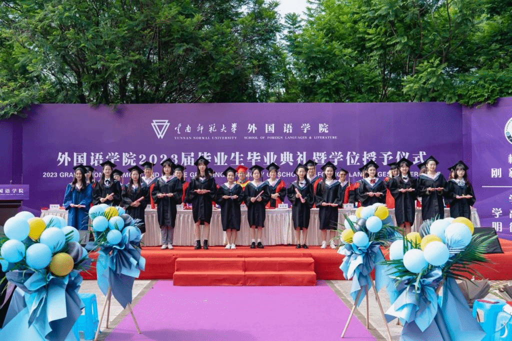 典礼在庄严的国歌声中拉开序幕。外国语学院党委书记王丽峰通报了学院2023届学生毕业、考研情况及获得优秀毕业生称号的情况,并对他们表示祝贺。随后,全体院领导和教师代表为60名省校级优秀毕业生和10名考研学生代表颁发了荣誉证书并合影留念。