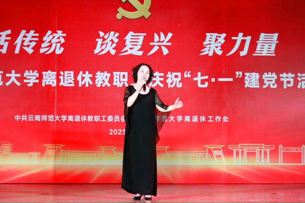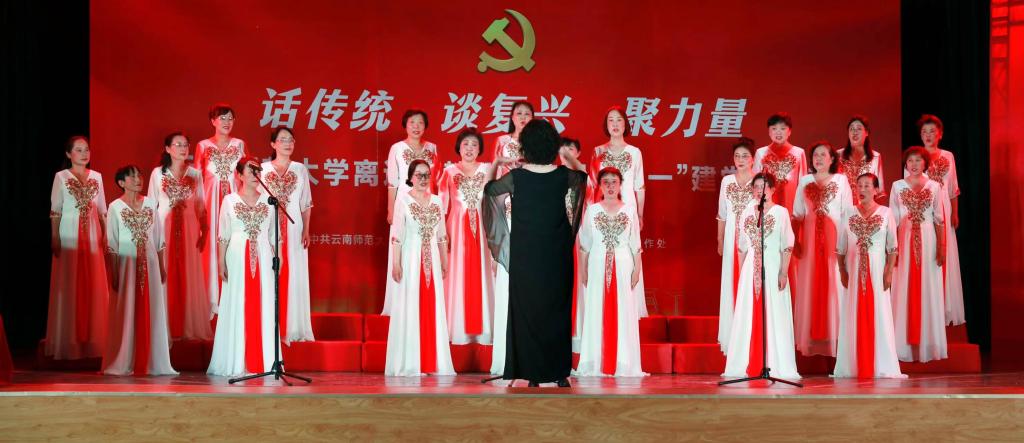 活动中,老年大学各专业班向大家展示了自己的学习成果,表演由舞蹈《我爱你祖国》、琵琶与诗朗诵《七一献诗》、中阮合奏《我的祖国》《茉莉花》、藏族舞蹈《次仁拉姆》、男声小合唱《南屏晚钟》 、舞蹈《红色娘子军》选段、女声小合唱《绒花》、女声独唱《我爱你中国》、舞蹈《盛开的牡丹颂祖国》等组成,充分展现了学校不断提高广大离退休教职工的文化素养和身心健康水平,实现“夕阳无限好,人间重晚晴”的靓丽美景。
