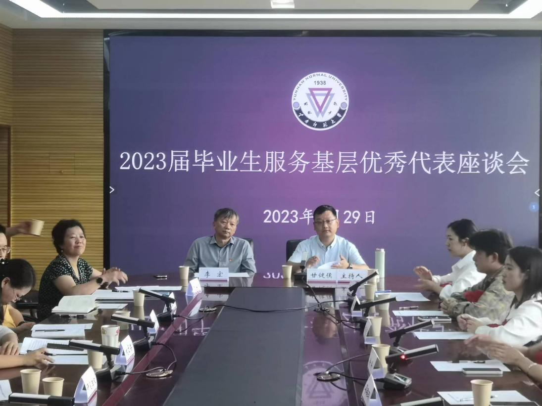 6月29日下午,2023届毕业生服务基层优秀代表座谈会在我校呈贡校区明德4号楼322会议室举行。校党委副书记李宏、副校长甘健侯以及就业处(创新创业学院办公室)、组织部、宣传部、学生处、校团委、研究生处、研究生院等单位负责人、2023届毕业生服务基层优秀代表及毕业生所在学院党委副书记、就业处相关工作人员参加了座谈会,会议由甘健侯主持。