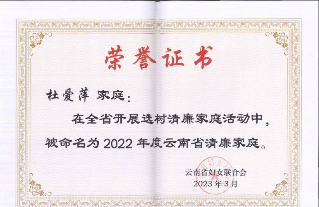 家风正则民风淳,民风淳则社稷安。为进一步筑牢家庭反腐倡廉防线,凝聚廉洁正能量,发挥广大党员干部家庭在推动党风廉政建设中的作用,为“清廉云南”建设营造风清气正的良好氛围,云南省妇联选树了一批清廉家庭。我校法学与社会学学院杜爱萍家庭获此殊荣。