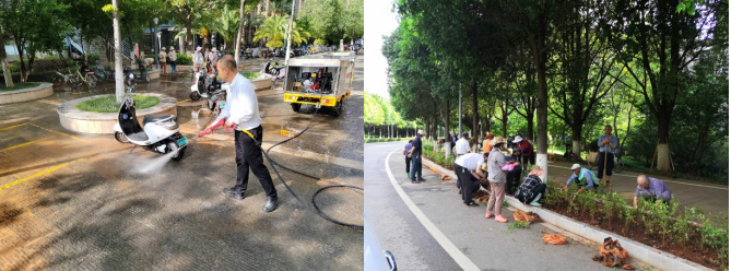 校园管理科督导物业服务公司对全校公共教室和所有楼宇公共区域的照明、窗帘、门窗等进行排查维修。督导绿化养护公司抓住暑假绿化养护黄金期,对校园老化、退化的灌木和绿篱进行更换,对退化的地被和草坪进行补植补种,对高大乔木进行修剪。