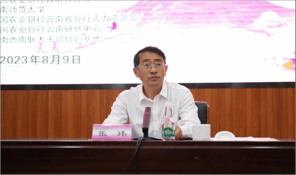 张玮在致辞中向参训的学员表示欢迎,向中国农业银行云南省分行对云南师范大学的信任和支持表示感谢。他介绍了云南师范大学和云南西南联大干部培训基地的发展历程以及基本情况,并就培训班的组织、管理、服务提出了具体要求,要求管理团队竭诚为学员提供高质量的教学和后勤保障服务。他希望各位学员珍惜机会,潜心修学,从学习中汲取智慧和力量,进一步提升理论素养和政治素质,增强爱岗敬业、奋发奉献意识,在新的人生征程中贡献自己的才华、青春和热情。