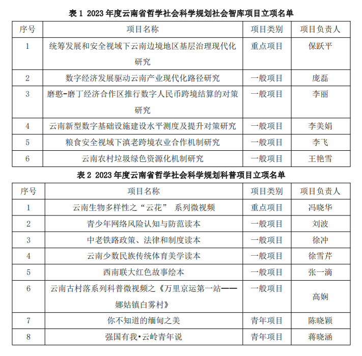 近日,云南省社会科学界联合会下达《2023年度云南省哲学社会科学规划智库项目及科普项目立项名单的通知》。我校获得智库项目立项6项,资助总额20万元。其中,重点项目1项、一般项目5项,较2022年度同比增幅100%;科普项目立项8项,资助总额31万元。其中,重点项目1项,一般项目5项,青年项目2项。智库项目和科普项目立项数及资助金额均位列全省第一,实现新突破。立项名单如下: