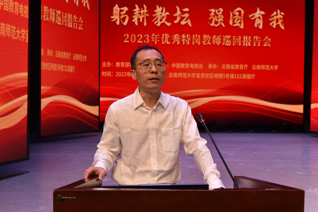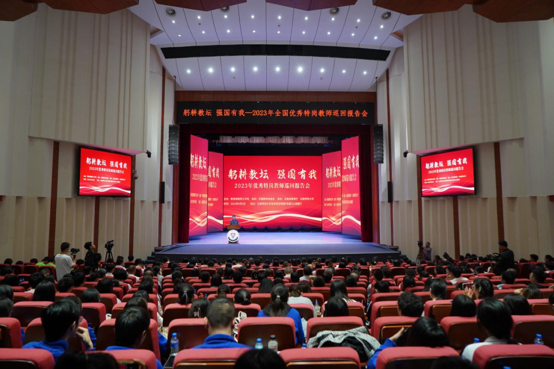 9月5日下午,在第39个教师节来临之际,“躬耕教坛 强国有我”全国优秀特岗教师巡回报告会在云南师范大学呈贡校区演播厅举行。云南省18所高校分别组织师生代表通过网络平台同步收看。