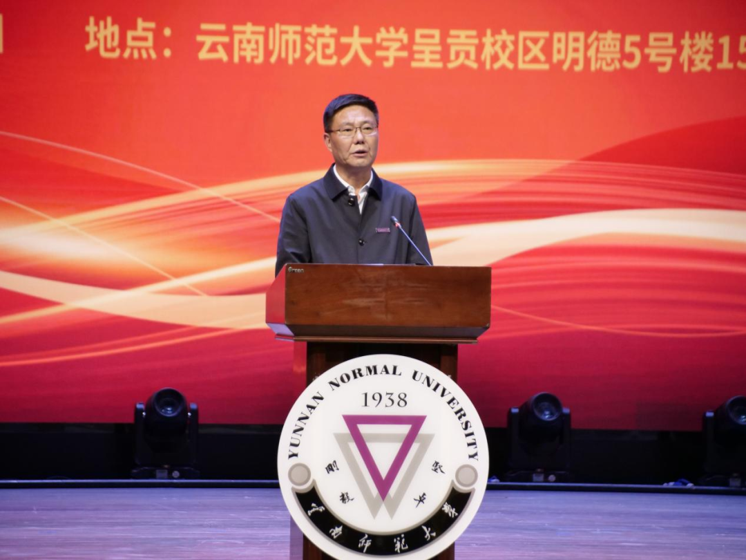 中国教育电视台科教思政中心主任李红根,云南省委教育工委、省教育厅相关部门负责人,云南师范大学全体校领导、各职能部门负责人、各学院(学部)党委副书记、师生代表参加现场报告会。