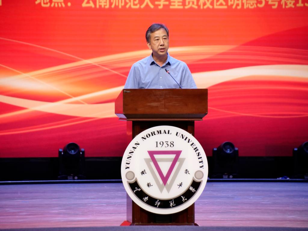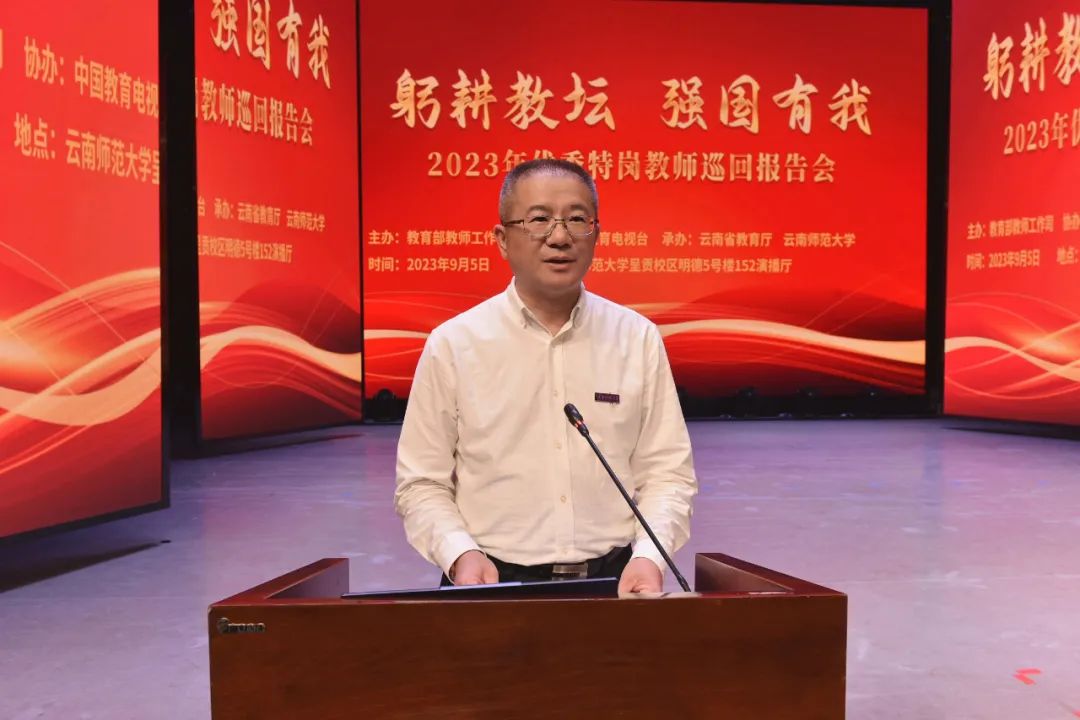 教育部教师工作司教师待遇与社会保障处一级调研员童春林、省教育厅一级巡视员曾继贤、云南师范大学党委书记张祖武出席报告会并讲话。报告会由云南师范大学校长王德强主持。