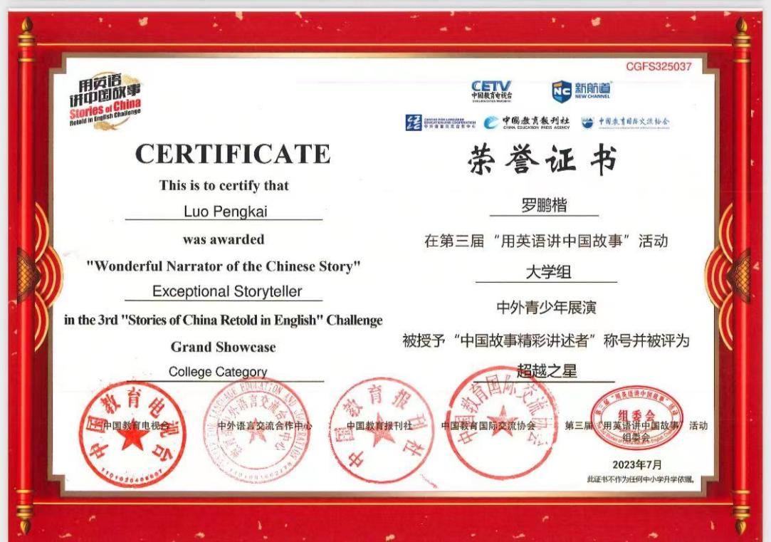 云南师范大学外国语学院罗鹏楷同学在“大学组”比赛中,以第3名的优异成绩荣获“中国故事精彩讲述者”“超越之星”称号,并获得奖金及教育服务基金。