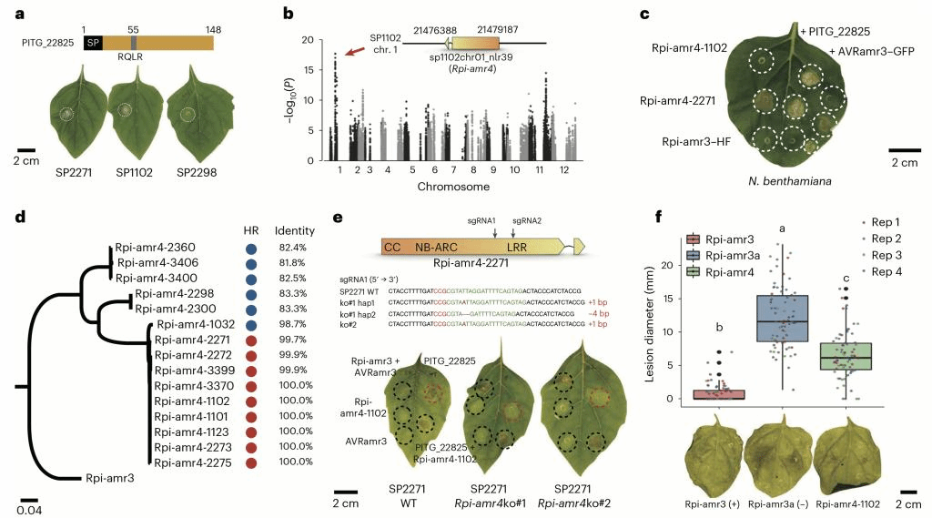 为了全面了解光果龙葵对马铃薯晚疫病的抗性,研究人员从世界范围内收集了52份光果龙葵种质,并对其进行了重测序,构建了光果龙葵种质与315个晚疫病效应子的ETI互作图谱,全面展示了病原菌与植物的免疫互作关系。通过全基因组关联分析,混池测序和抗病基因富集测序等方法,研究团队克隆到3个效应子的免疫受体Rpi-arm4,R02860和R04373。
