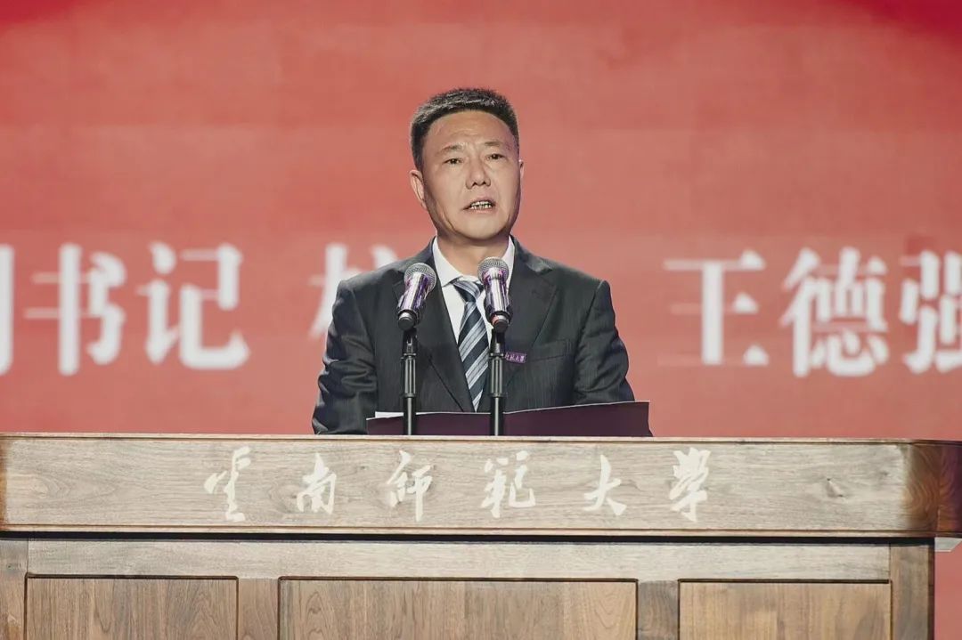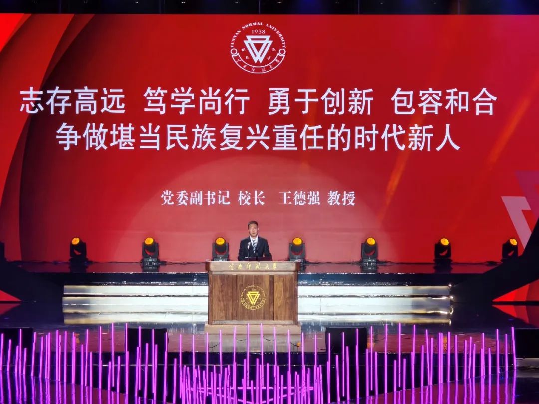 校长王德强代表全校师生员工对自全国各地的新同学们表示欢迎,向辛勤培育同学们的父母和老师致以敬意。在总结过去几年学校发展成就的同时,王德强表示,云南师大是西南联大历史记忆的承载者,更是西南联大精神的传承者。今年恰逢西南联大在昆建校暨云南师范大学建校85周年。85年来,云南师大以传承弘扬西南联大精神、服务云南基础教育、引领教师教育发展为己任,为国家培养各级各类人才30余万人,被誉为“红土高原上人民教师摇篮”。