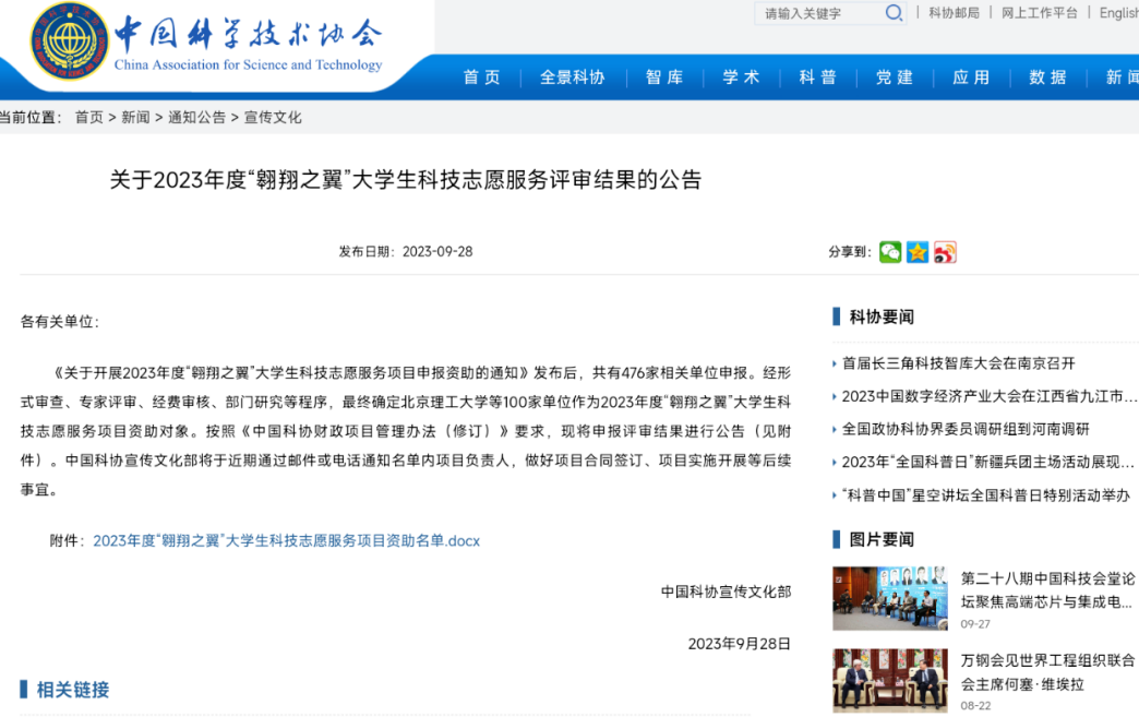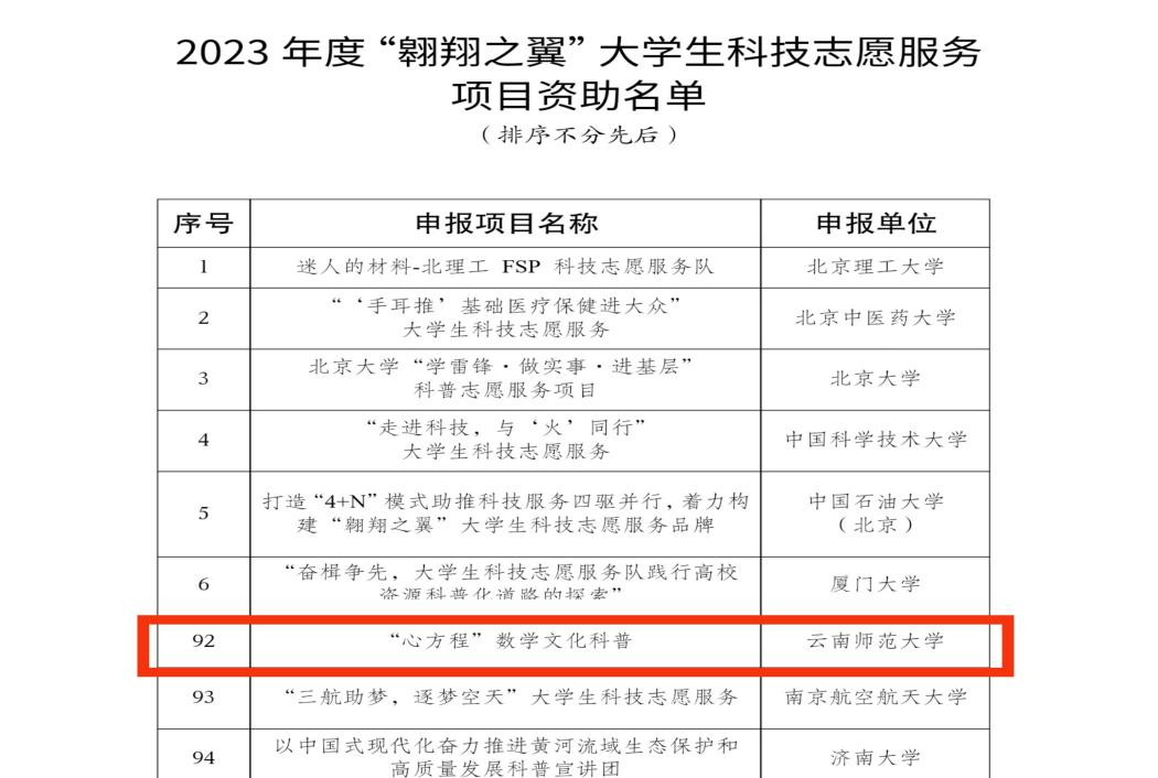 9月28日,中国科学技术协会发布了2023年度“翱翔之翼”大学生科技志愿服务项目评审结果公告。评审标准按照《中国科协、教育部、共青团中央、中央文明办关于联合开展高校大学生科技志愿服务工作的通知》的总体部署进行,项目由中国科协面向全国范围遴选,共有476家相关单位申报,经形式审查、专家评审、经费审核、部门研究等程序,共选出100家单位获批立项资助。我校推荐的“心方程”数学文化科普项目获批立项。