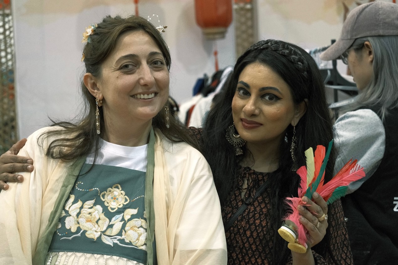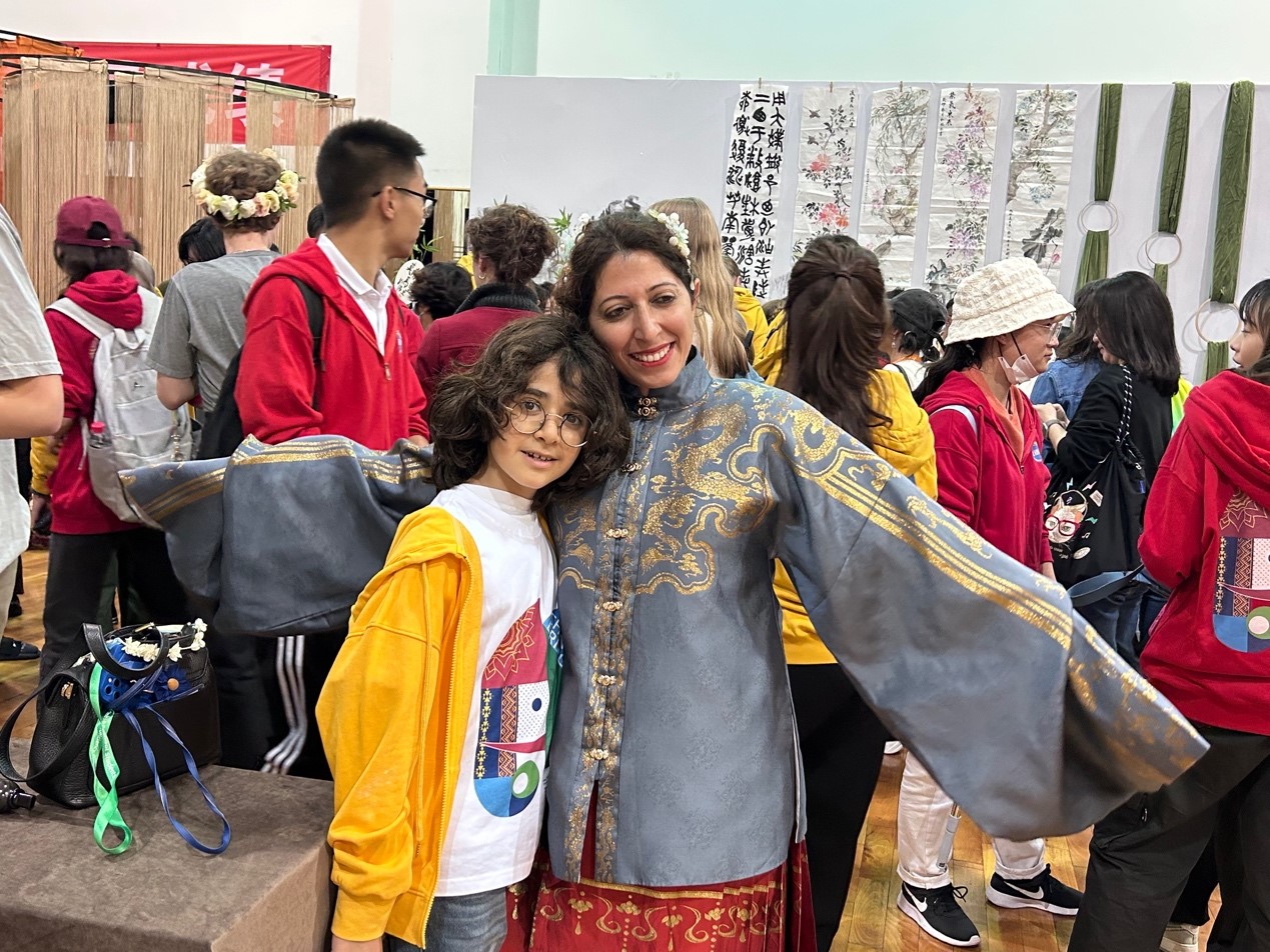 头上倭堕髻,耳中明月珠。缃绮为下裙,紫绮为上襦。簪、钗、环、步摇、珠花整齐地摆放在汉服旁供试穿汉服的外国友人挑选。褪去刚开始的羞涩,他们争先试穿精美的汉服。“我想穿这套,上面的花纹很好看”“我想试试这套,我很喜欢它的颜色和样式”“这些衣服都好精致,好想把它们都穿身上”。不停地有人穿梭其中,尽情挑选着自己想要的风格。“我很喜欢这件红色的,它跟我头上戴的这个花环颜色很搭,我想要穿上它待会去跳一支中国舞蹈《燕无歇》,中国的舞蹈很美丽。”来自印度尼西亚的黄子嘉说道。