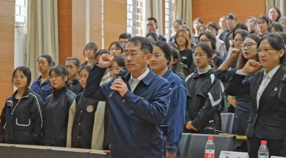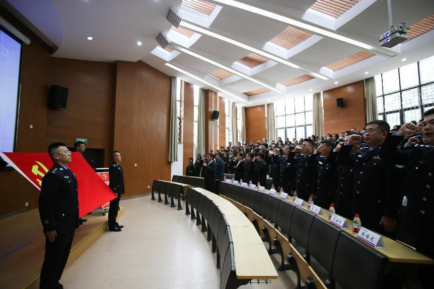 全体党员师生、民警在张玮的带领下,面向庄严的党旗重温入党誓词。