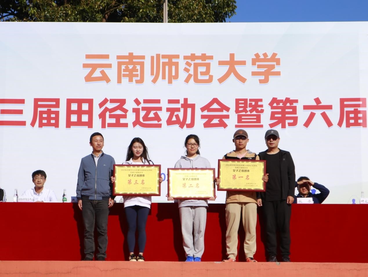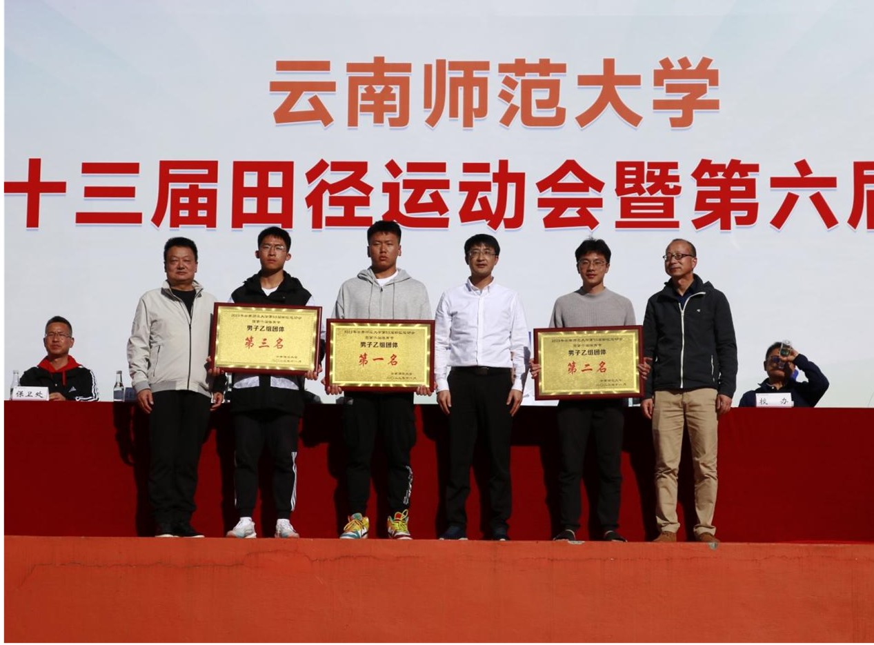 田径运动会赛事主管助理杨光会宣布了团体奖项,甲组男生团体前8名依次是职业技术教育学院、历史与行政学院、化学化工学院、物理与电子信息学院、数学学院、地理学部、信息学院、外国语学院;甲组女生团体前8名依次是历史与行政学院、职业技术教育学院、教育学部、云南华文学院、数学学院、文学院、经济与管理学院、化学化工学院。乙组男生团体前3名依次是2023体育教育、2023运动训练、2022体育教育;乙组女生团体前3名依次是2023体育教育、2023运动训练、2021运动训练。
