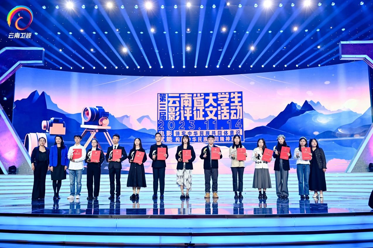 活动现场还进行了第三届云南省大学生影评征文颁奖。本次征文活动收到了85所院校投递的870篇作品,经评审委员会专家评审,我校传媒学院陈嘉雯、邱青青、周晓婷、王雨鑫4名同学获得本科生组优秀作品奖,张齐、谭辉、李淼3位老师获得优秀教师奖。