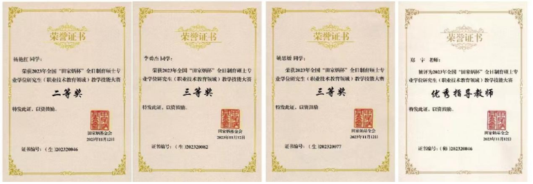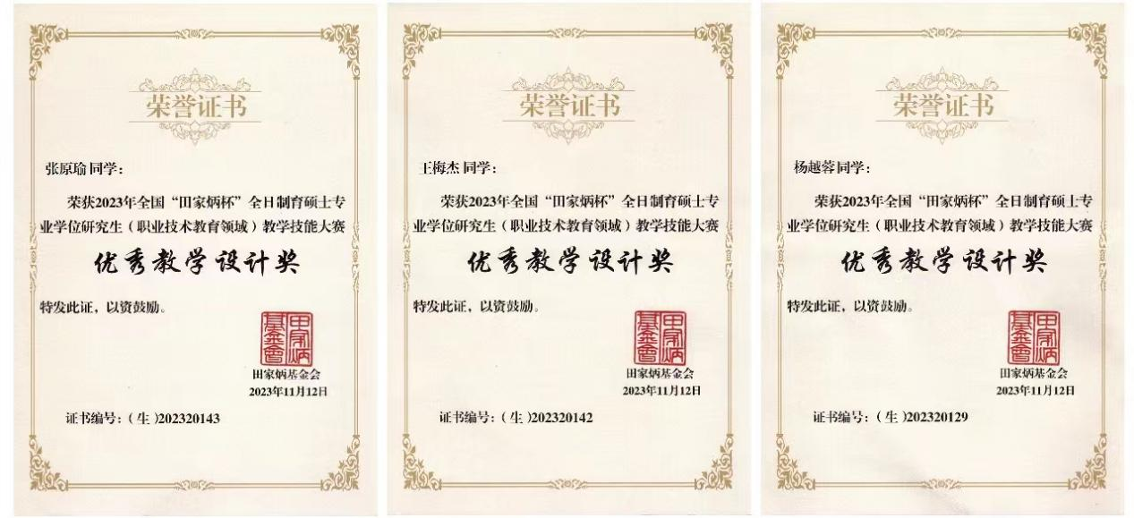 11月10日至12日,2023年全国“田家炳杯”全日制教育硕士专业学位研究生(职业技术教育领域)教学技能大赛决赛在湖南师范大学举行。经过激烈角逐,我校职业技术教育学院7位参赛选手从157名参赛选手中脱颖而出,杨艳红同学获二等奖,姚思媛、于航、李勇杰同学获三等奖,张原瑜、王梅杰、杨越蓉同学获优秀教学设计奖,郑宇老师获“优秀指导教师”。