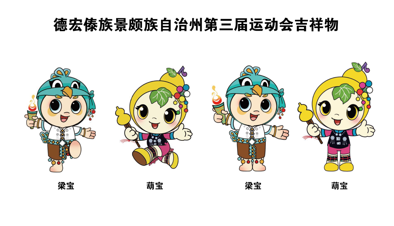 吉祥物命名梁宝、葫宝,是州运会形象品牌的重要载体,体现了州运会承办城市梁河独特的民族文化和精神风貌。吉祥物头部以葫芦造型、孔雀形象为模型,分别体现孔雀之乡德宏、葫芦丝之乡梁河的地域特色。