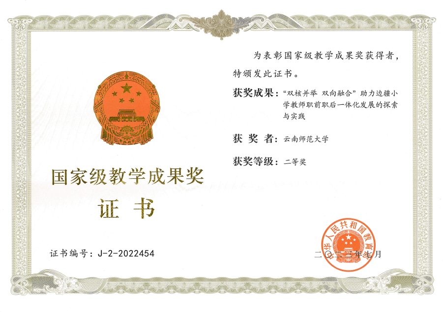 11月22日,云南省教育厅颁发了2022年国家级教学成果奖证书和奖章,由我校职业技术教育学院牵头完成的云南师范大学教学成果《“双核并举 双向融合”助力边疆小学教师职前职后一体化发展的探索与实践》获国家级教学成果二等奖。这是云南省高校首次获得国家级基础教育教学成果奖,是对学校近年办学成果的充分认可和肯定,是对我校基础教育、人才培养工作和教育教学改革成果的检阅和展示,也是学校深化基础教育教学改革的标志性成果。