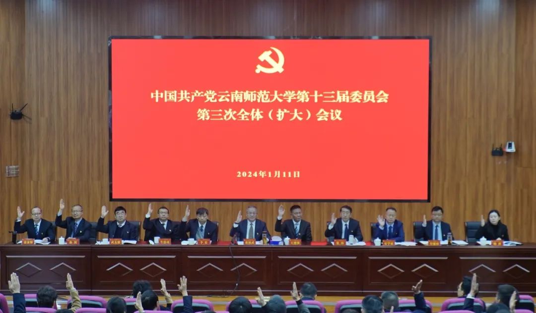 1月11日,中国共产党云南师范大学第十三届委员会第三次全体(扩大)会议在呈贡校区召开。校党委委员出席会议,非党委委员的校领导,校纪委委员,非党委委员的各职能部门主要负责人,非党委委员的各学院(学部)、附属中小学党政主要负责人,学校第十三次党员代表大会部分代表列席会议。
