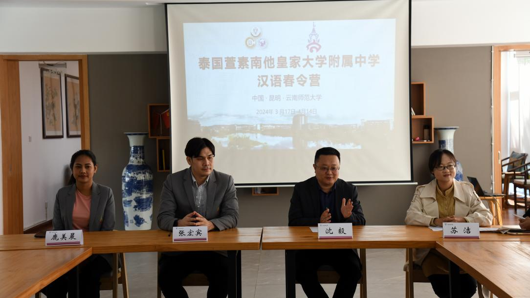 3月18日上午,泰国萱素南他皇家大学附属中学汉语春令营开营仪式在云南师范大学呈贡校区国际汉语教育学院举行。汉语国际推广师资培训基地(昆明)常务副主任沈毅,泰方领队教师张宏宾、鹿美晨,24名泰国高中学生参加了开营仪式。