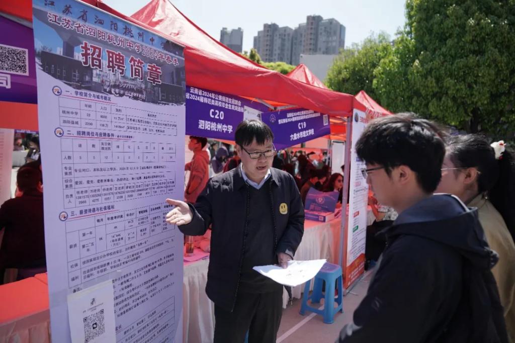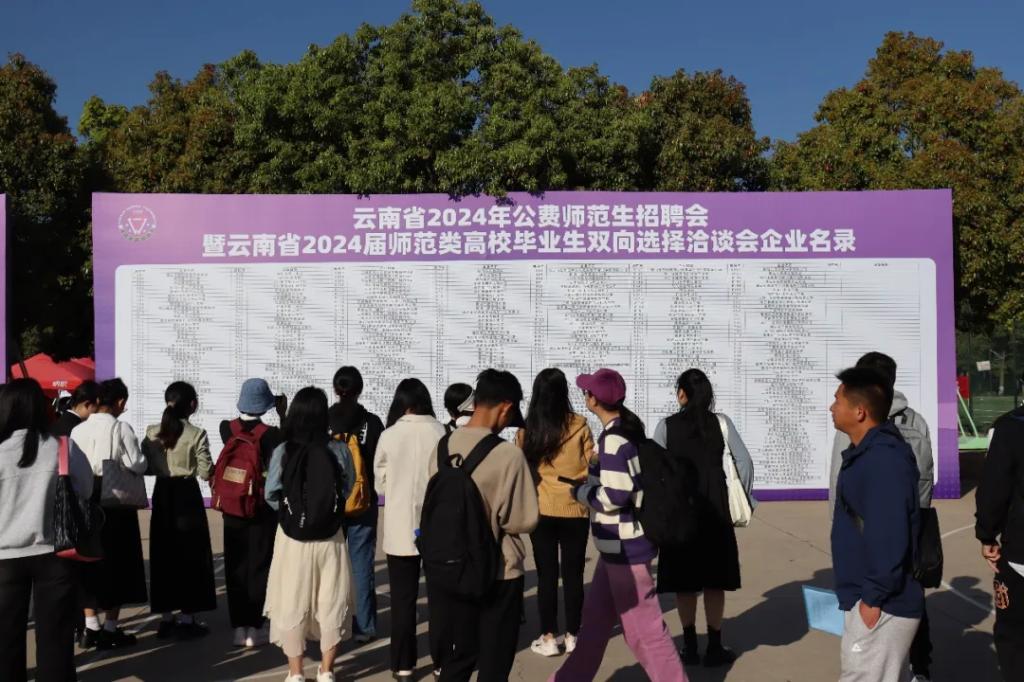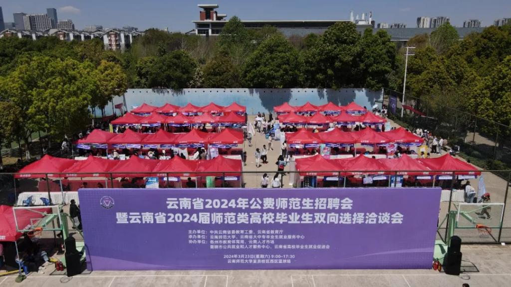 春光明媚,风和日丽。3月23日,云南省2024年公费师范生招聘会暨云南省2024届师范类高校毕业生双向选择洽谈会在云南师范大学呈贡校区西区篮球场举行。本次招聘会由云南省委教育工委、省教育厅主办,云南师范大学和云南省大中专毕业生就业服务中心承办,各州市教育体育局、云南省人才市场、昆明市公共就业和人才服务中心、云南省高校毕业生就业促进会协办,来自云南、广西、广东、北京、江西、浙江、贵州、江苏、山东、四川、湖南、内蒙古、海南、上海等14个省(市、区)共393家用人单位(省内用人单位353家,省外用人单位40家),近2万名毕业生参加了招聘会。云南省大中专毕业生就业服务中心主任杨宏伟、云南师范大学副校长陈正权到招聘会现场指导,与用人单位代表和毕业生亲切交流,详细了解招聘岗位的设置数量、毕业生的求职意愿和签约情况,并鼓励广大同学抓住机会、大胆尝试,理性规划职业生涯,积极投身基层建设。