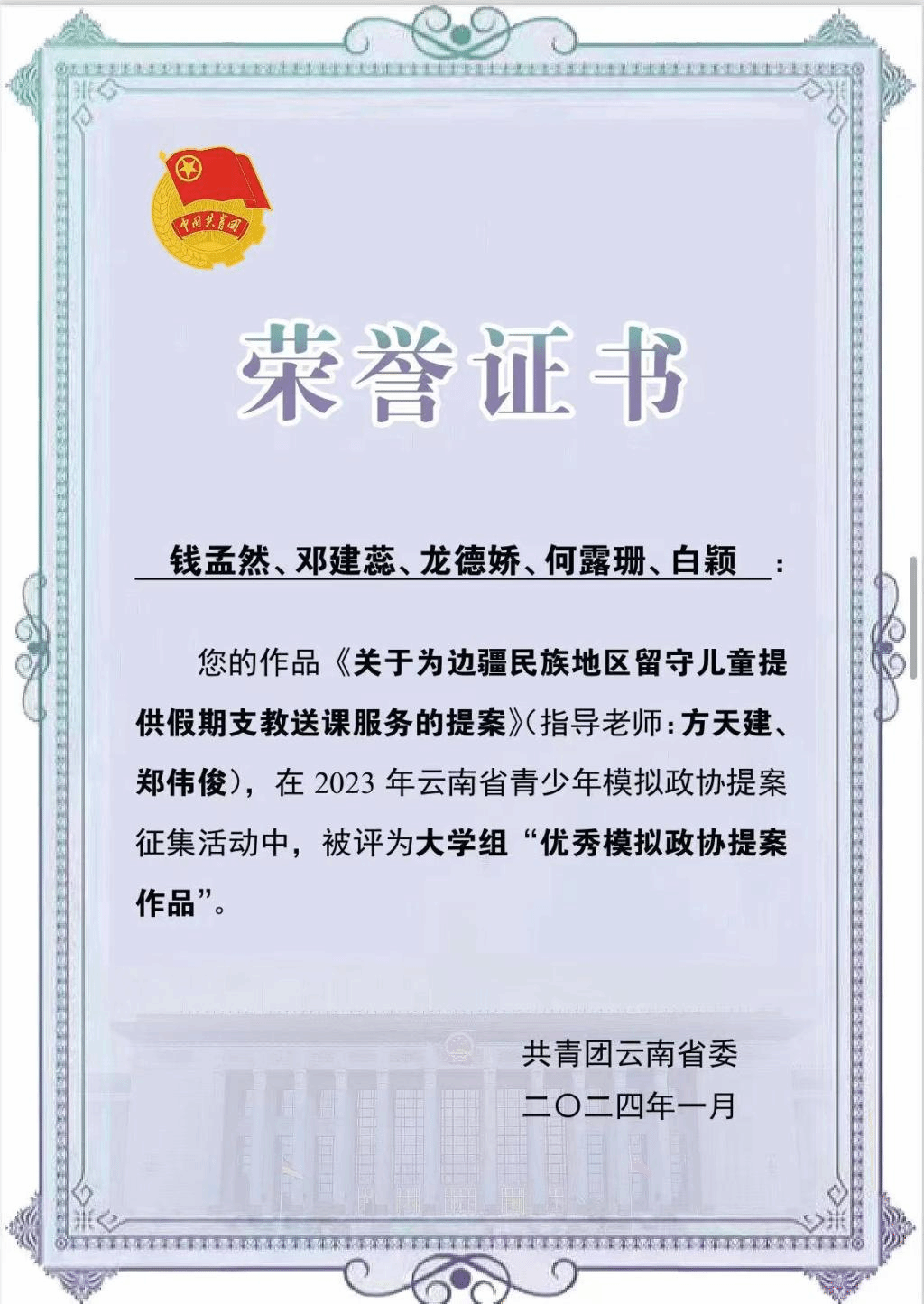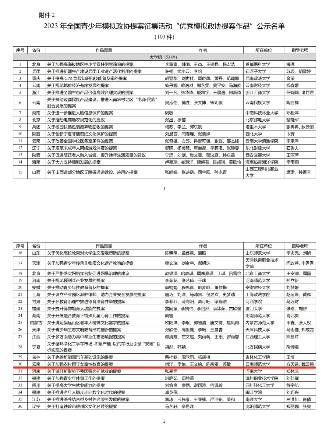 近日,2023年全国青少年模拟政协提案征集活动评审结果公布。由云南师范大学历史与行政学院方天建、魏云鹤老师指导,肖洋、李怡、王文绘、陈宗攀、苏敏同学团队提交的“关于加强农村留守女童性教育的提案”从参与全国评审的875件模拟提案作品中脱颖而出,获评“优秀模拟政协提案作品”。此前,由云南师范大学方天建、郑伟俊老师指导,钱孟然、邓建蕊、龙德娇、何露珊、白颖同学提交的“关于为边疆民族地区留守儿童提供假期支教送课服务的提案”获云南省青少年模拟政协提案“优秀模拟提案作品”。