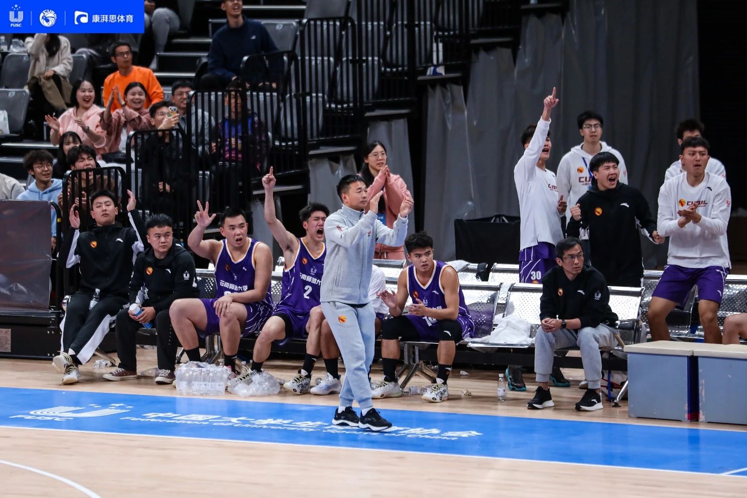 比赛期间,篮球队领队牛治亮副校长、体育学院党委书记华致雄、体育学院副院长李翼飞到场看望队员,并对率队出征的女篮教练欧阳宇华、余红艳,男篮教练刘翔、朱觊在备战期间和比赛过程中的付出给予充分肯定。
